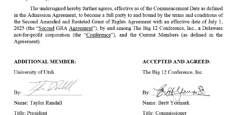 I received a copy of Utah’s agreement with the Big 12 today. It includes the Grant of Rights (as amended and restated). The full document is attached below.